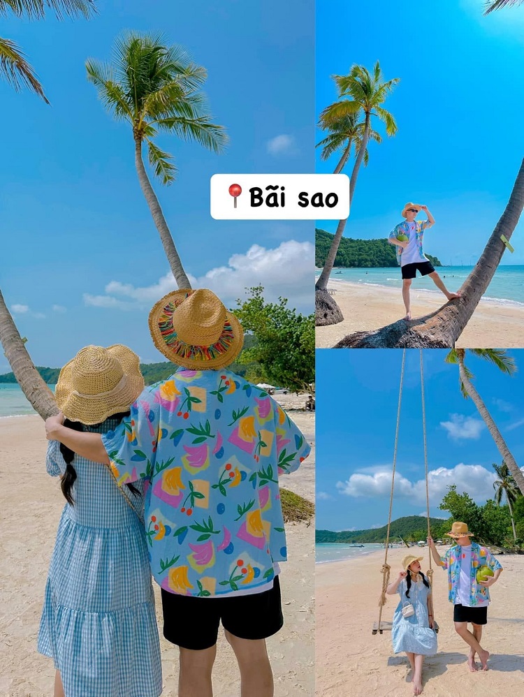 Bãi Sao là bãi biển sở hữu dải cát trắng mịn đặc trưng và nước biển xanh ngọc trong vắt. Ghé thăm bãi biển xinh đẹp hàng đầu này ở Phú Quốc bạn có thể tắm biển thư giãn, nằm võng dưới hàng dừa xanh hoặc check-in với xích đu trên cây dừa nghiêng huyền thoại của du lịch Phú Quốc.